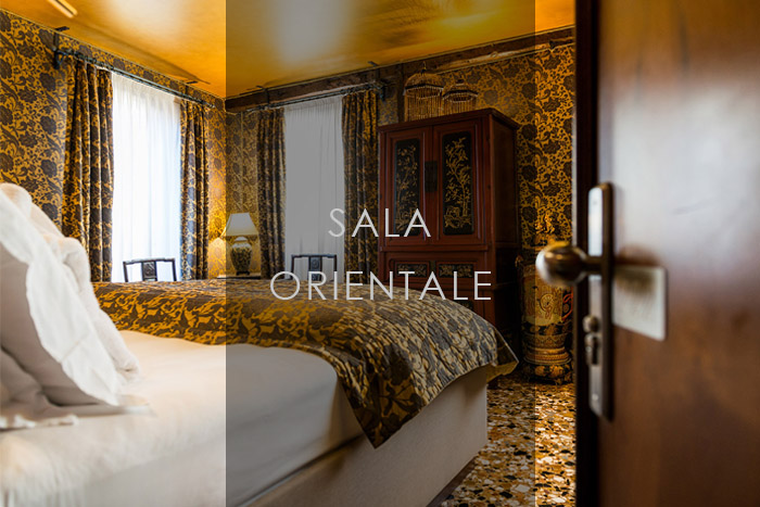 La seta alle pareti e le porcellane di ispirazione cinese sembrano raccolti dallo scrittore veneziano sull’antica Via della Seta. Il pavimento e’ un raro esempio di lavorazione alla “Palladiana” originale del 1700 e contiene pietre provenienti da cave oramai estinte.